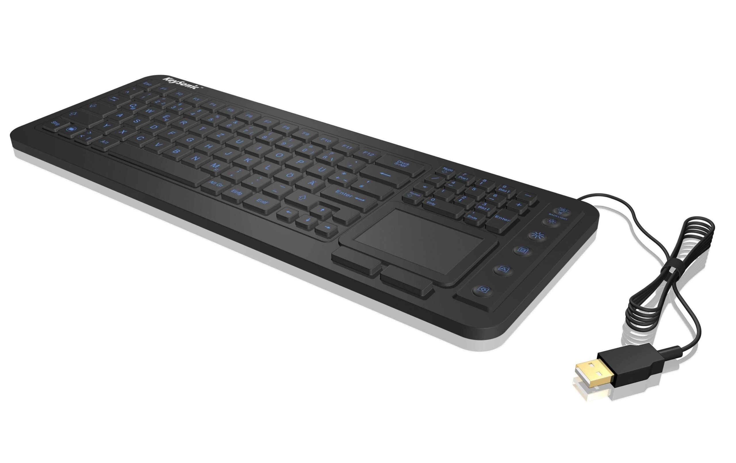 Tastatur Typ: Standard, Tastaturlayout: QWERTZ (CH), Tastatur Features: Abwasch-/desinfizierbar, Beleuchtung, Touchpad, Ziffernblock, Keyboard Tasten: Chiclet (Notebook), Detailfarbe: Schwarz, Ziffernblock: Ja KeySonic Silikon-Tastatur m. USB, IP68