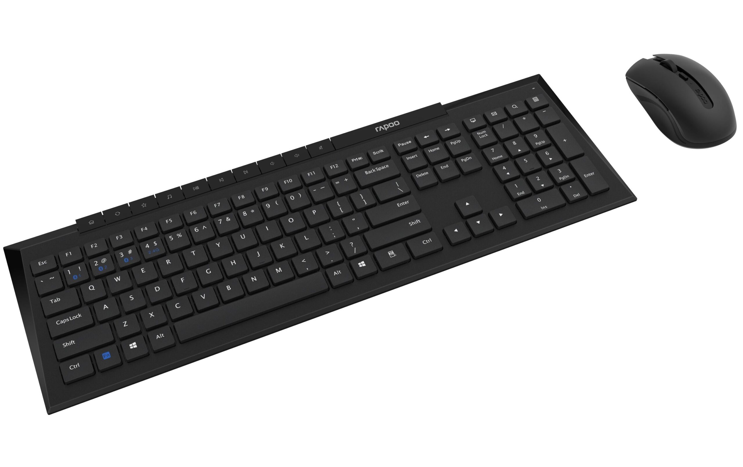 Maus Features: Scrollrad, Seitliche Zusatztasten, Umschaltbare DPI-Auflösung, Tastatur Typ: Business, Standard, Tastaturlayout: QWERTZ (CH), Tastatur Features: Hotkeys, Spritzwassergeschützt, Ziffernblock, Keyboard Tasten: Klassisch (Knöpfe), Detailfarbe: Schwarz RAPOO 8210M Optical Deskset schwarz 2.4Ghz + Bluetooth